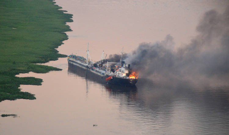 A raíz del impacto, el barco argentino se incendió por completo por la rotura de su casco, pero los tripulantes alcanzaron a saltar al agua. Lo mismo hicieron los navegantes paraguayos.