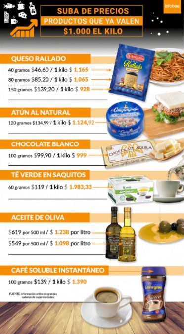 Para cada uno de estos rubros, claro, hay opciones más económicas si se toman en cuenta otros productos de las mismas categorías, e incluso las segundas o terceras marcas. En ese caso, los rangos para los mismos productos arrancan desde los $800 a $900 por kilo.
