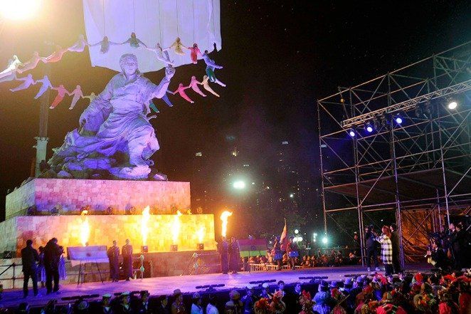 Luego, Cristina junto a Morales -ambos vistiendo sombreros rituales del altiplano- y con el marco de los bailarines y músicos bolivianos, descorrió el velo que rodeaba la obra y descubrió así el monumento de 16 metros del artista argentino Andrés Zerneri, construido en bronce, y donado por el gobierno de Bolivia para su emplazamiento en Buenos Aires.