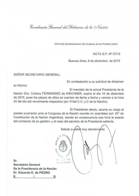 Natalio Etchegaray emitió un dictamen en el que aclara que el mandato de la Presidenta termina "a las 24 del 10 de diciembre", y que el mandatario electo, en este caso Mauricio Macri, "asume su cargo al prestar juramento ante el Congreso reunido en asamblea".