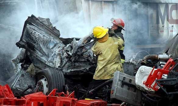 Personal de Bomberos provincial trabajó en las tareas para lograr rescatar a los choferes de estos dos camiones, pero murieron carbonizados al quedar atrapados en las cabinas de los vehículos siniestrados.