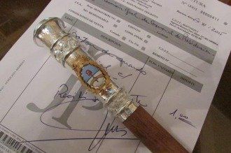 Al anuncio de culminación de la obra Pallarols adjuntó la foto del bastón, con su empuñadura de plata en la que destaca el escudo nacional, apoyado sobre una factura por 1 peso como pago simbólico por su trabajo, remitida a la Dirección General de Ceremonial de Presidencia.
