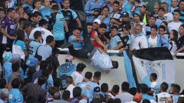 En ese momento un grupo comienza a atacarlo, pero es alcanzado y luego arrojado al vacío desde una de las tribunas, cayendo desde una altura de más de tres metros.