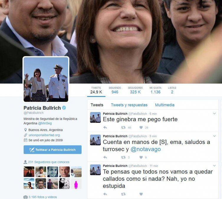 La cuenta de Twitter de la Ministra de Seguridad de la Nación fue intervenida por un usuario que hasta hizo público el número de teléfono de la funcionaria. “Este ginebra me pego fuerte”, fue uno de los posteos.