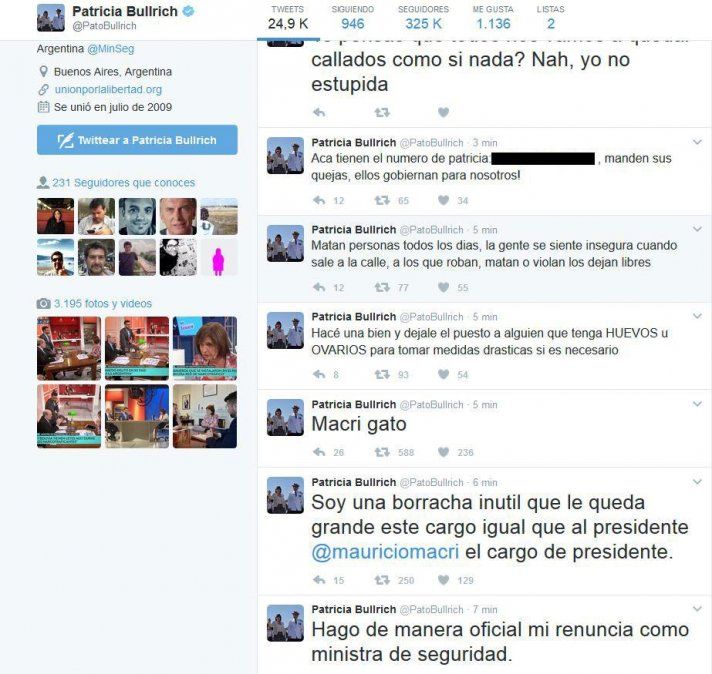 “Hago de manera oficial mi renuncia como ministra de seguridad”, fue el primer mensaje publicado desde el perfil que generó un estado de alerta ante una eventual nueva dimisión del equipo de Cambiemos. Sin embargo, un segundo mensaje abrió la sospecha de que todo se trataría de un ataque cibernético. “Soy una borracha inutil que le queda grande este cargo igual que a Mauricio Macri el cargo de presidente”, había escrito.