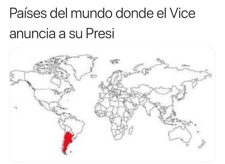 Pero lo más gracioso fueron las ironías a través de textos, imágenes y videos en Twitter, Instagram y Facebook. La sorpresa no paralizó la imaginación, como lo demuestra este mapa de los países del mundo donde el vice anuncia al presidente: