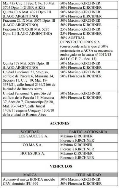 Ahora los fiscales Pollicita y Mahiques pidieron el embargo preventivo del patrimonio de Máximo y Florencia: 16 inmuebles, un automóvil declarado por el contador Víctor Manzanares por $ 153.615 y de tres participaciones societarias por $ 13.723.686. Estas tres empresas (Hotesur, Los Sauces SA y CoMa SA) son investigadas en diferentes causas por la Justicia.