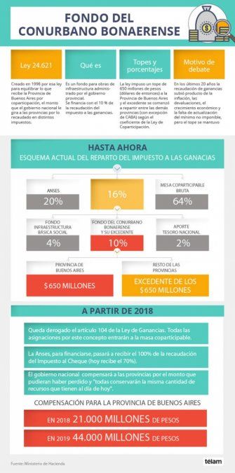 - Fondo del Conurbano: se compensa a Buenos Aires “por la eliminación de la asignación específica contemplada en el inciso b del artículo 104 de la Ley de Impuesto a las Ganancias. La compensación será administrada por la provincia, se destinará a