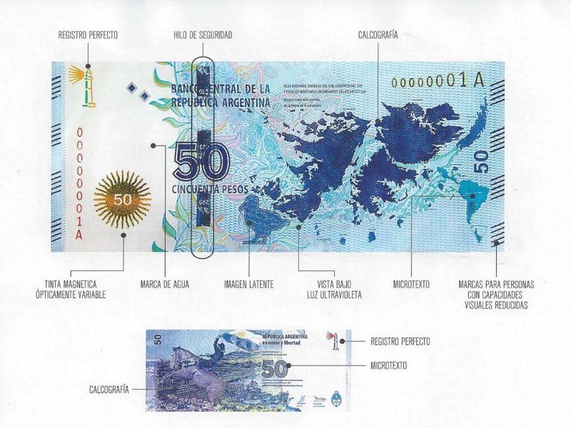 Además de su significativo valor numismático, el nuevo billete de 50 pesos representa un momento histórico de la moneda nacional, puesto que por primera vez el protagonismo no es de un rostro humano, sino que refleja el reclamo inclaudicable del pueblo argentino por el derecho soberano sobre las Islas Malvinas, Georgias del Sur, Sandwich del Sur y espacios marítimos circundantes.