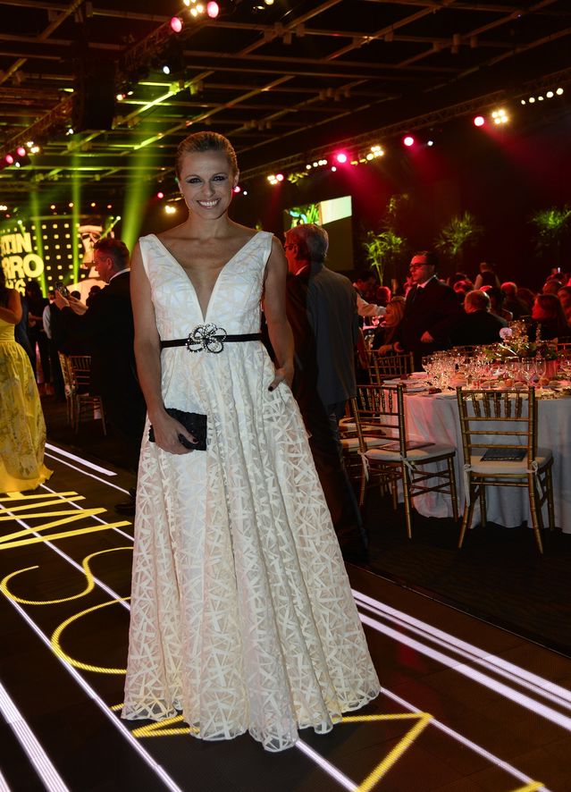 Impactó con un modelo de Javier Saiach, con un importante bordado en el pecho.
