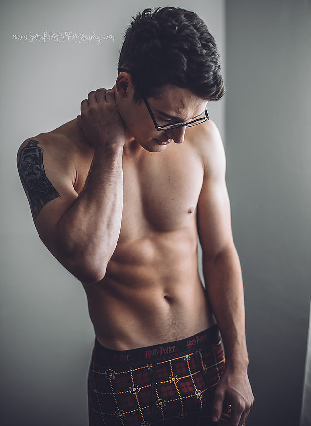 Bueno, las gafas no le sientan nada mal. Son el complemento perfecto en una sesión en la que la varita en la mano, la sonrisa y la cicatriz igual que la del personaje de ficción – y que le hizo Voldemort- pasan prácticamente desapercibidas al lado de este cuerpo de gimnasio. En la sesión vemos al modelo vestido con el jersey y los colores granate y amarillo que siempre han caracterizado a Harry. Incluso con los calzoncillos a conjunto.