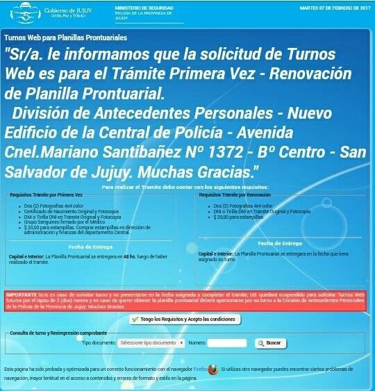 Desde la policía de la provincia de Jujuy informaron que a partir de hoy se podrán obtener turnos para la Planilla Prontuarial y para la validación de la misma desde dos nuevas direcciones web.