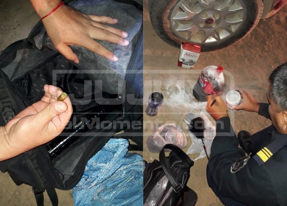 En el auto Fiat Punto se encontraron recibos de sueldos de la Policía de Jujuy a nombre de uno de ellos, y con la presencia de dos testigos, se secuestraron del interior, mochilas, prendas de vestir, lazo trenzado de cuero, soga de color negra, parlantes, zapatillas, un cartucho calibre 9 mm, linterna, entre otros elementos.