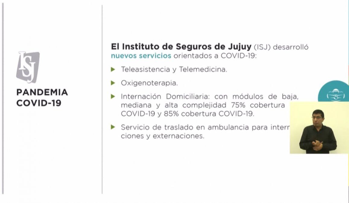 Seguidamente, pese a los numerosos reclamos, destacó el trabajo del Instituto de Seguros de Jujuy, la obra social de los estatales, y ennumeró todos los servicios que incorporó en pandemia como teleasistencia, telemedicina, oxigenoterapia, internación domiciliaria, etc.