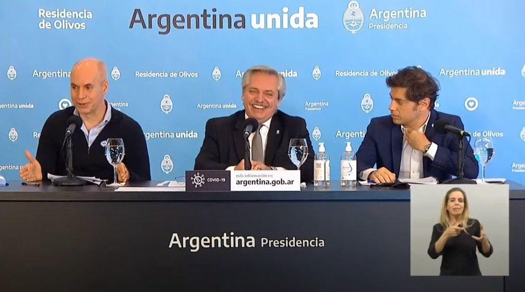 Todo eso tuvo la conferencia de prensa que brindaron la noche del sábado 23 de mayo el presidente Alberto Fernández, el jefe de gobierno de la Ciudad Autónoma de Buenos Aires, Horacio Rodríguez Larreta y el gobernador de la provincia de Buenos Aires, Axel Kicillof en la quinta presidencial de Olivos.