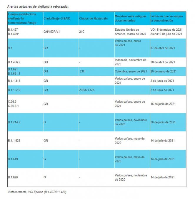 Más allá de esta situación, la OMS definió degradar a Épsilon, le quitó su nombre griego, y la ubicó entre los linajes de “alertas de vigilancia reforzada”.