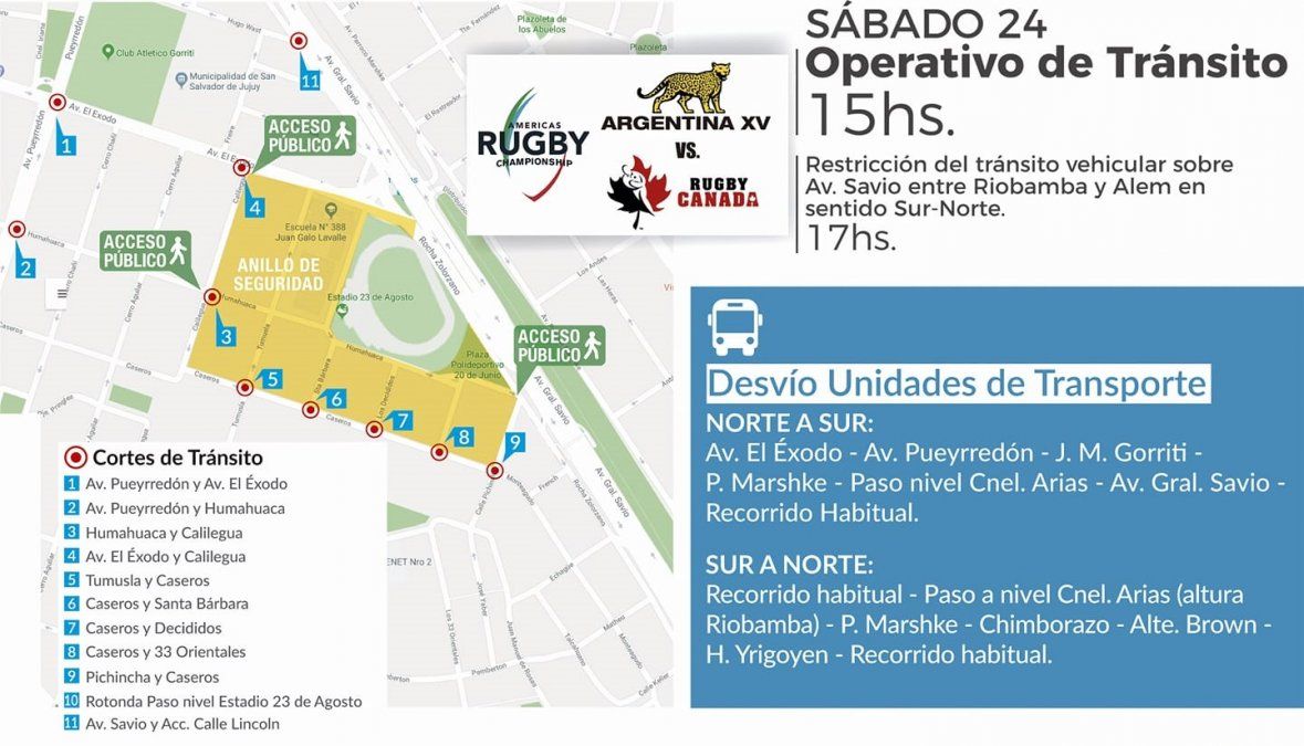 Este sábado 24 en el estadio 23 de Agosto se llevará a cabo el partido correspondiente al Americas Rugby Championship para lo cual se dispuso un importante operativo de tránsito y seguridad que iniciará desde temprano.