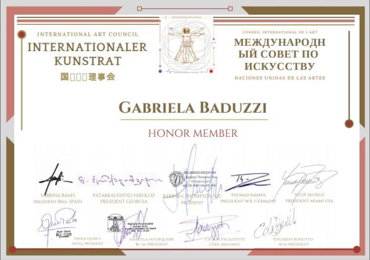 La jujeña Gabriela Baduzzi se convirtió en Miembro de Honor del International Art Council (Consejo Internacional de todas las Artes - CIA), que es la organización internacional de todas las formas de arte de todos los países del mundo. Cuenta con miembros de más de 170 países y está asociada a la Organización de las Naciones Unidas para la Educación, el Arte, la Ciencia y la Cultura (UNESCO).