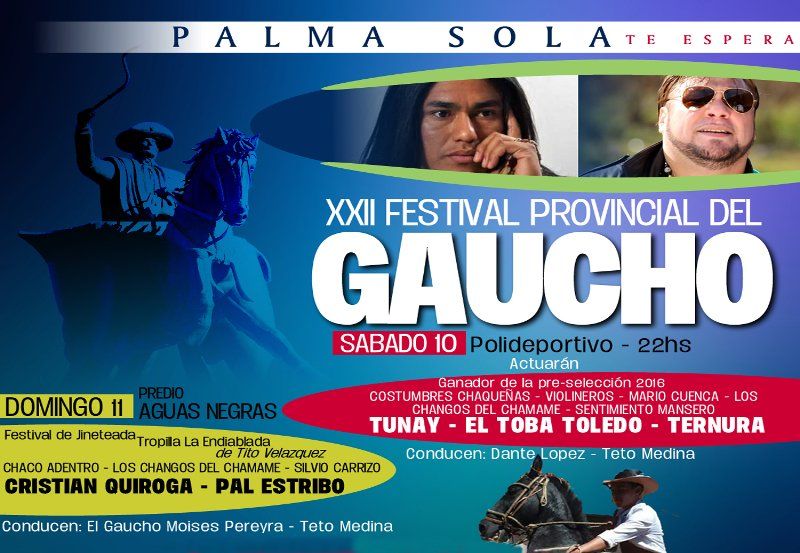 A horas 22.00 actuarán los conjuntos locales Sentimiento Chaqueño, Chaco Adentro, Cristian Quiroga y Pal Estribo, finalizando así la semana de festejos por el Día Nacional del Gaucho en la localidad de Palma Sola “Cuna de las Tradiciones Gauchas”.