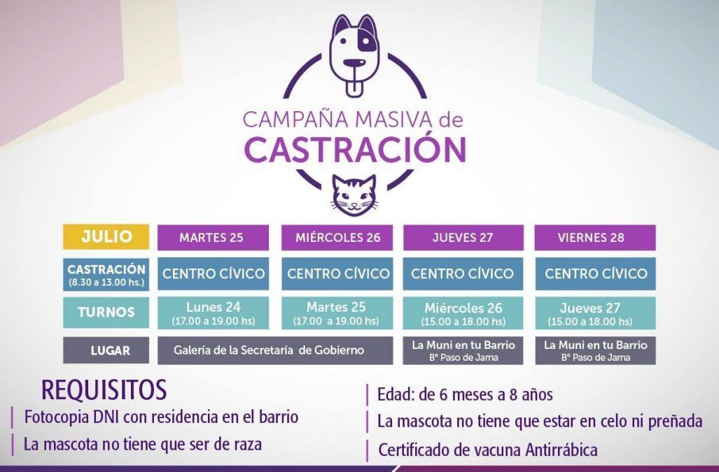 Los turnos se entregan con un día de anticipación y son limitados. La castración se lleva a cabo en el Centro Cívico de 8:30 a 13:00.