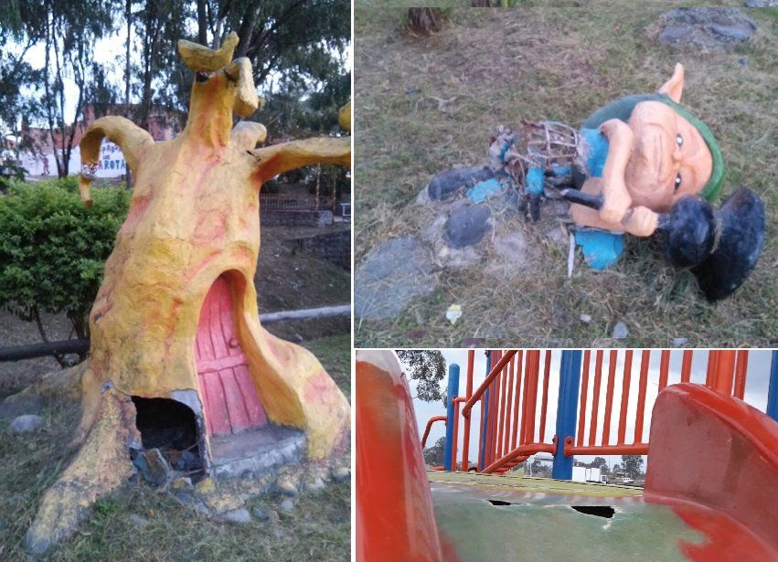 La plaza ubicada en el acceso a Palpalá se caracterizaba por su atractivo en las figuras y esculturas trabajadas para los más chicos. Ahora, el llamado de atención está en el descuido que tienen las imágenes, además de varios juegos rotos.
