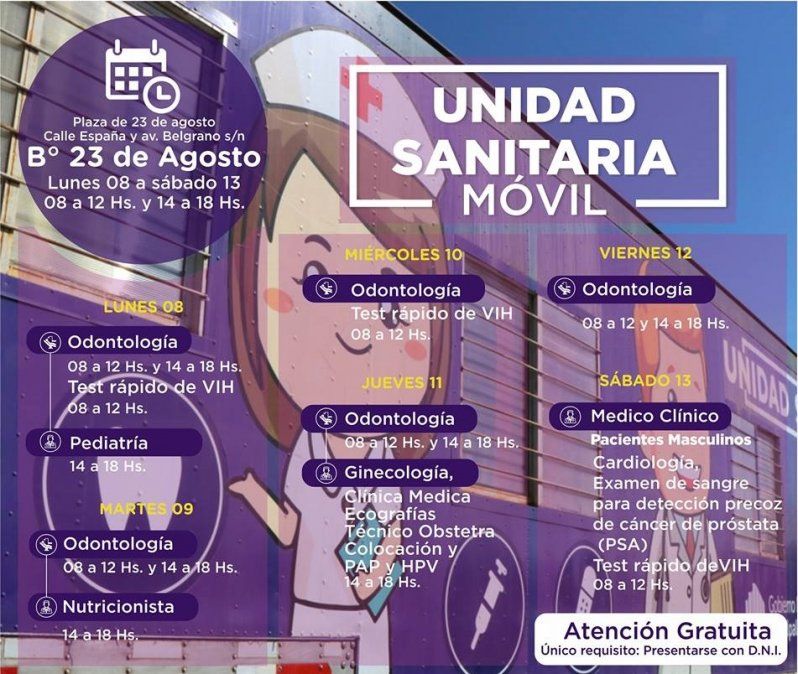 Del lunes 8 al sábado 13 de octubre se instalarán en el el barrio 23 de agosto, en la Plaza ubicada en calle España y Av. Belgrano. El horario de atención es de 8:00 a 12:00 y de 14:00 a 18:00.