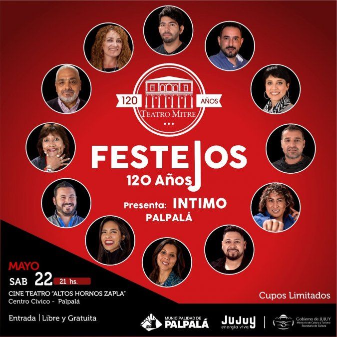Este sábado 22 de mayo a las 21 hs., el Cine Altos Hornos Zapla recibirá la presentación de "ÍNTIMO", el espectáculo que dio apertura a los festejos de los 120 años del Teatro Mitre. Se presentarán 12 destacados artistas del ámbito cultural jujeño con entrada libre y gratuita.