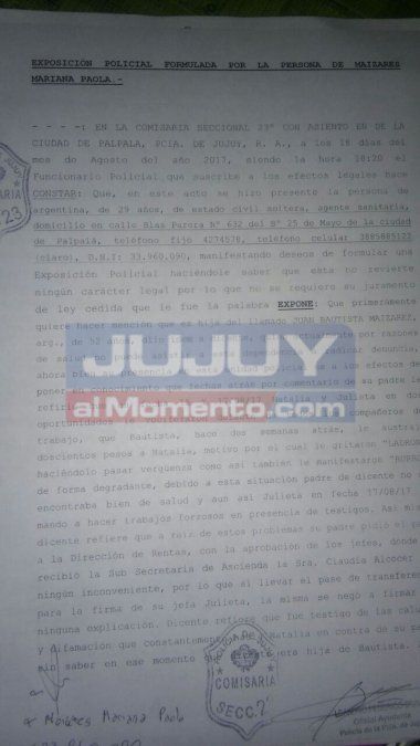 La hija de Juan Bautista Maizares radicó una exposición policial en la comisaría 23 de Palpalá