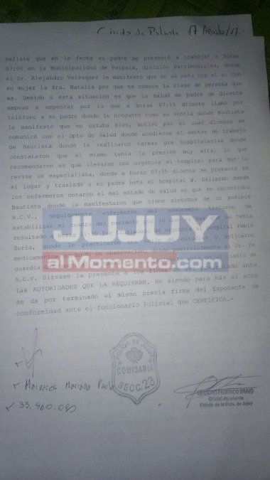 Según relató la hija de Juan Bautista Maizares, el empleado con 33 años de servicio en el Área de Patrimoniales de la Municipalidad de la Ciudad Siderúrgica fue acusado frente de todos sus compañeros por robo e irregularidades en su desempeño. Según denuncia, debido a los malos tratos habría sufrido una crisis nerviosa que le provocó un ACV, por lo que tuvo que ser trasladado, primeramente al Hospital Gallardo y luego al Pablo Soria por la gravedad del cuadro.
