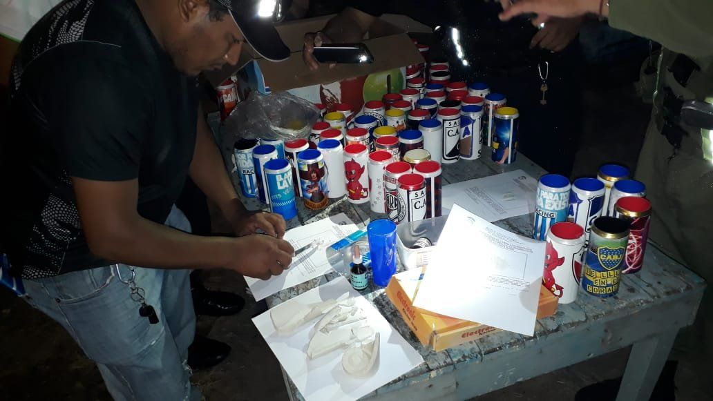 Una vez abiertos se constató que contenía recipientes tipo vasos, de elaboración casera construidos con latas de cerveza y cubiertos en la parte interna con plástico relleno de una sustancia blanquecina.