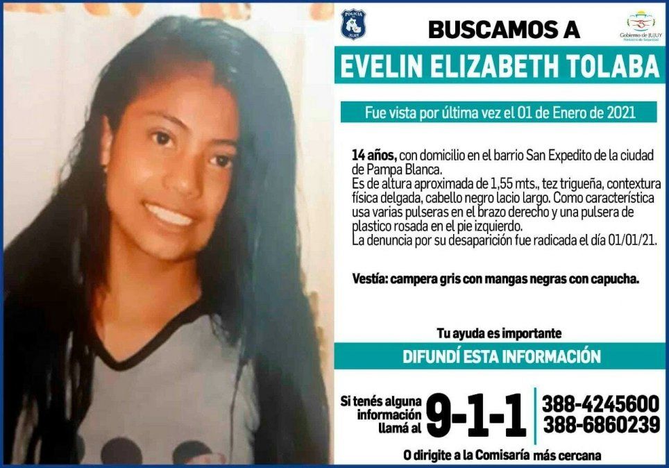 Evelin Elizabeth Tolaba es de contextura delgada, tez trigueña, cabello largo lacio de color negro, de altura aproximada de 1,55 mts y como característica particular usa varias pulseras en el brazo derecho y una pulsera de plástico rosa en el pie izquierdo.