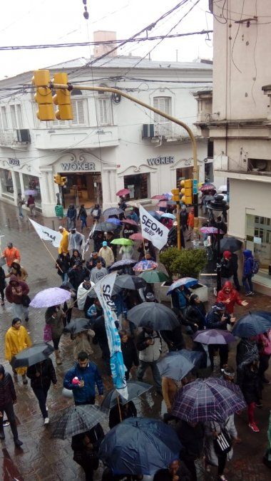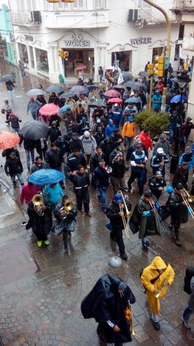Temprano esta mañana, se pudo ver una importante columna de manifestantes desplazándose bajo la lluvia por las calles céntricas hacia Plaza Belgrano.