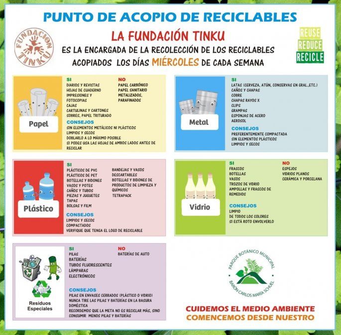 Para el cuidado del medio ambiente, una de las opciones es el Parque Botánico de la ciudad, donde recepcionan materiales reciclables que luego son retirados por la Fundación Tinku para llevar a cabo las tareas correspondientes.