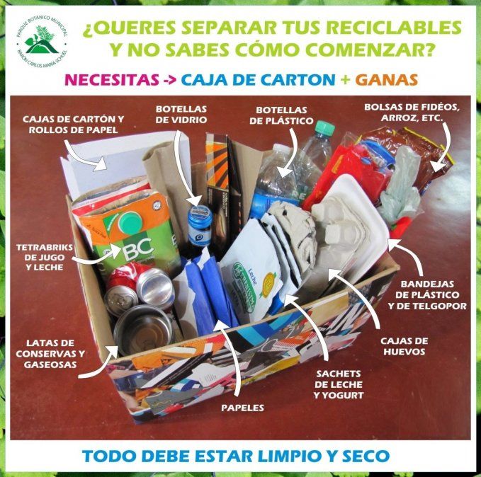 Las cosas que se acerquen al lugar pueden ir desde cajas de cartón y rollos de papel, botellas de vidrio, de plástico, bolsas de plástico, sachets, cajas de huevo, papeles, latas y botellas, bandejas de plástico, hasta telgopor. Se recomienda que cada uno de estos productos esté separado uno del otro, además de estar limpios y secos, en caso contrario contaminan al resto de los materiales y pueden llegar a pudrirse.