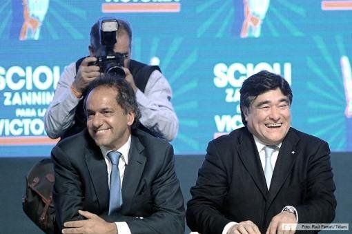 La fórmula presidencial del Frente para la Victoria, integrada por el gobernador bonaerense, Daniel Scioli, y el secretario de Legal y Técnica, Carlos Zannini, se impone en las PASO al obtener el 38,81 por ciento de los votos a nivel nacional, con el 56,47 por ciento de las mesas escrutadas.