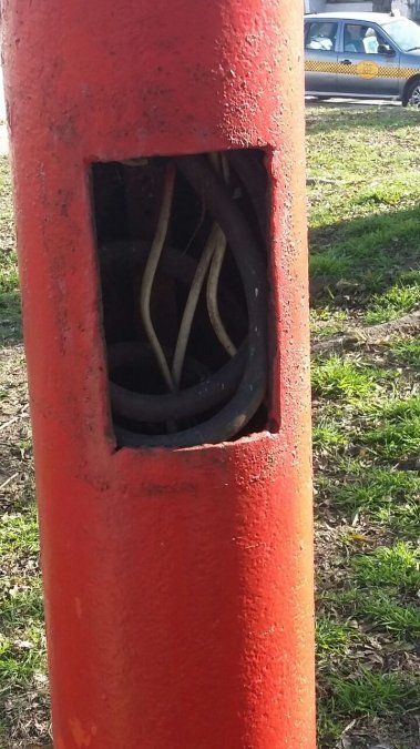 La plaza del Barrio 9 de julio de la ciudad siderúrgica tiene todos los postes de luz sin tapas con los cables al descubierto, un peligro para los que visitan el lugar.