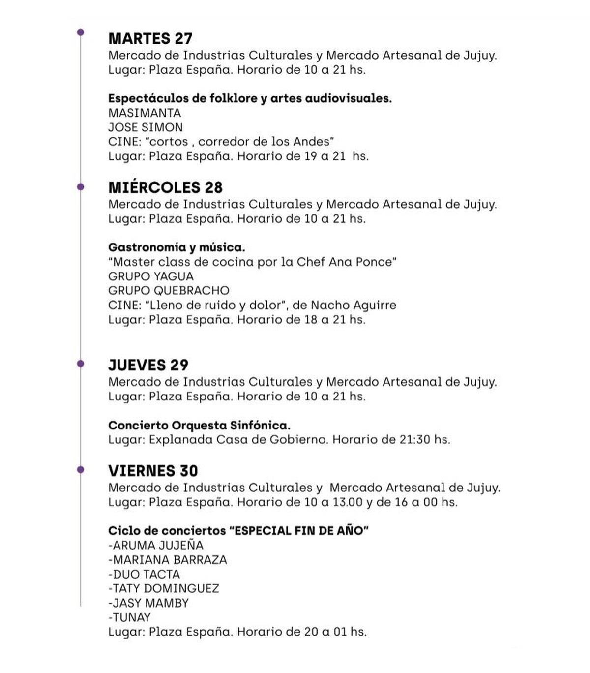 Jujeños y turistas podrán seguir disfrutando estos días de la programación del “Ciclo de Conciertos en Casa de Gobierno”, que prevé el despliegue de artesanos y artistas de las industrias culturales en la Plaza España, hasta el viernes 30 de diciembre.