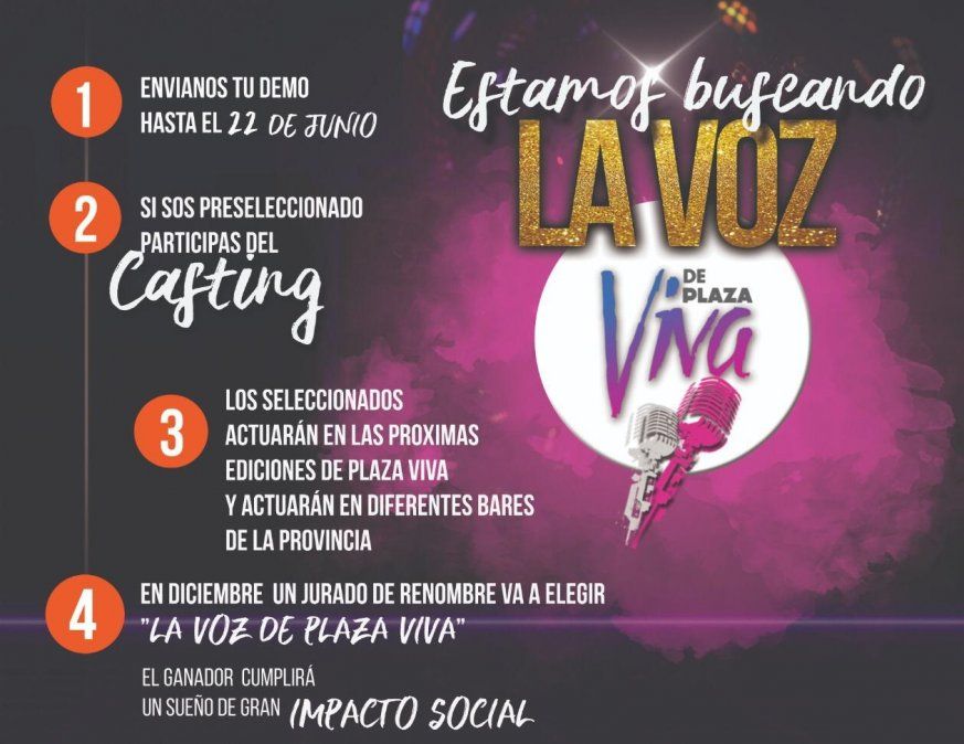 Aquellos interesados que deberán enviar su video cantando al Facebook de Plaza Viva, el plazo finaliza el 22 de junio. Los preseleccionados participan del casting.
