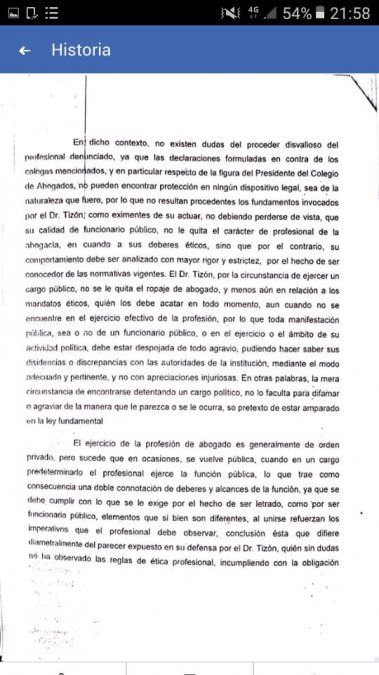 En su resolución, el tribunal de Ética y Disciplina reitera en más de una oportunidad que Tizón, además de ser funcionario público es abogado y que por ello debe acatar en todo momento los "mandatos éticos" aún cuando no se encuentre en el ejercicio efectivo de su profesión.