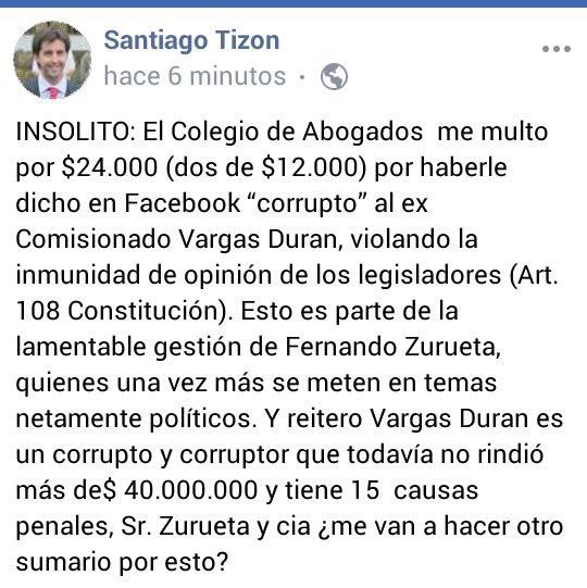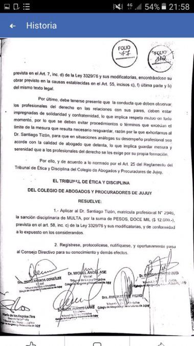 Al respecto el abogado Santiago Tizón manifestó lo siguiente: "estoy sorprendido con esta resolución del Colegio de Abogados de Jujuy que resolvió meterse en una cuestión netamente política como son las expresiones de un legislador.
