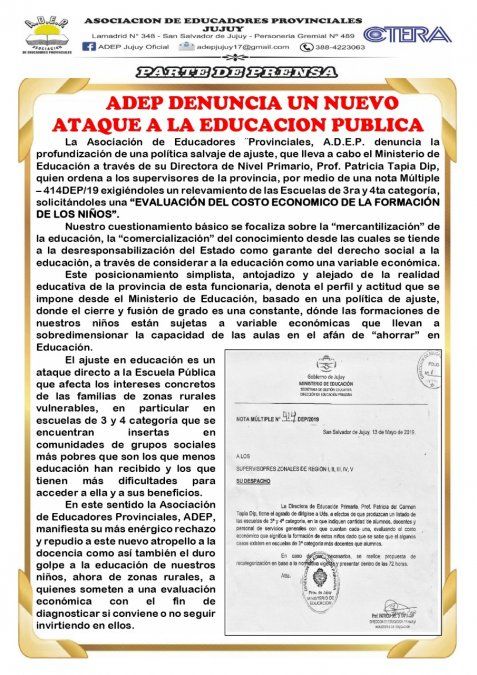 ADEP acusó al Ministerio de Educación de profundizar en “una política salvaje de ajuste”, luego de que se les enviara a los supervisores zonales de Región I, II, III, IV y V, una nota en la que se les pide una evaluación del “costo económico de la formación de los niños”.