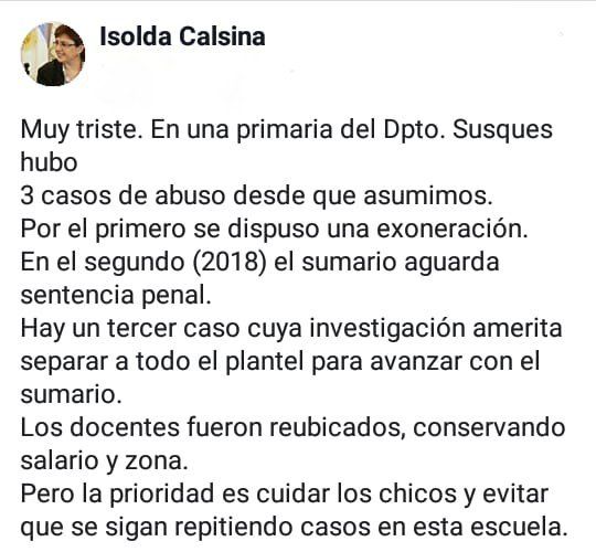 La propia titular de la cartera educativa, Isolda Calsina informó vía Twitter que desde el 2015 a la fecha ocurrieron tres supuestos casos de abuso en el departamento puneño: