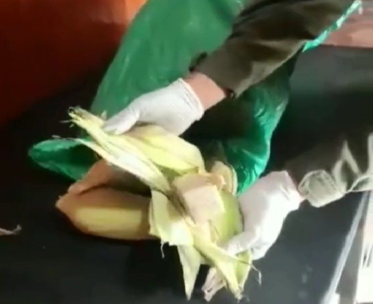 El sujeto transportaba bolsas conteniendo lo que en apariencia eran choclos, pero al ser requisado por personal de Gendarmería en Tres Cruces, se descubrió que en el interior de las chalas había paquetes rectangulares de color blanco.