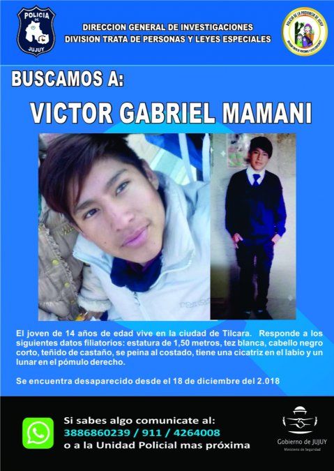 La División trata de personas y leyes especiales busca intensamente a Víctor Gabriel Mamani, un adolescente de 14 años oriundo de la ciudad de Tilcara y quien se encuentra desaparecido desde el 18 de diciembre del 2018.