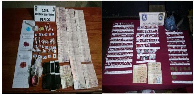 El último procedimiento, logrado tras otro allanamiento en la ciudad de Perico en un domicilio de Las Pampitas, donde se procedió a la detención de dos personas de sexo masculino mayores de edad, y el secuestro de varias dosis de cannabis sativa (marihuana), dinero en efectivo, teléfonos celulares, un motovehículo y elementos para el fraccionamiento.