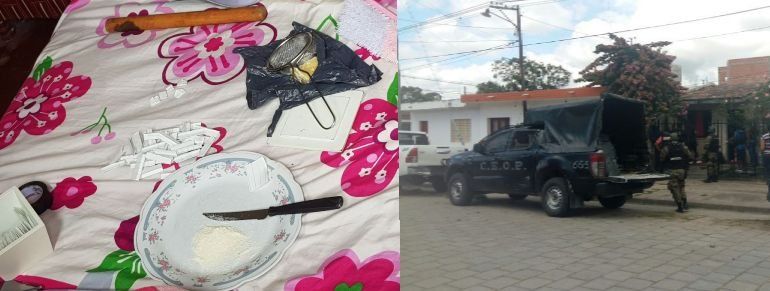 El operativo arrojó 275 gramos de Pasta Base, 10 ravioles de cocaína, 8500 pesos, 300 papeles listos para fraccionar, ralladores, coladores, entre otros elementos.