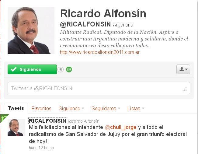 "Mis felicitaciones al Intendente @chuli_jorge y a todo el radicalismo de San Salvador de Jujuy por el gran triunfo electoral de hoy!" expresó Alfonsín, cuyo mensaje fue reproducido por numerosos tuiteros jujeños.