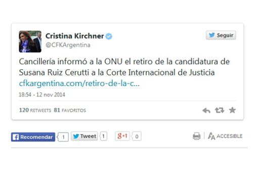 Con seis tuits publicados cerca de las 19 que reproducían el comunicado de Cancillería que informaba la decisión argentina de retirar la candidatura de Susana Ruiz Cerutti a la Corte Internacional de Justicia, Cristina regresó a la red social tras diez días.