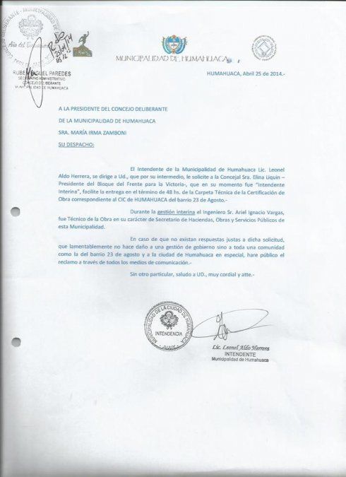 En la primera nota el intendente “Lito” Herrera solicita a la presidente del Concejo Deliberante, señora Irma Zamboni, que por su intermedio solicite a la concejal Elina Liquín (que en su momento fue intendente interina), que facilite la entrega en un término de 48 horas de la carpeta técnica de certificación de obra correspondiente al CIC del barrio 23 de agosto de Humahuaca. A su vez informa que durante la gestión interina el ingeniero Ariel Ignacio Vargas, fue el técnico de la obra en su carácter de secretario de Haciendas, Obras y Servicios Públicos de esta municipalidad. En la nota, Herrera advierte que en caso de que no existan respuestas justas a dicha solicitud – lo que lamentablemente no hace daño a una gestión de gobierno sino a toda una comunidad como la del barrio 23 de Agosto y a la ciudad de Humahuaca en especial - hará público el reclamo a través de todos los medios de comunicación.