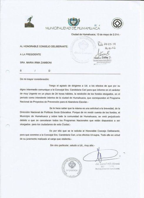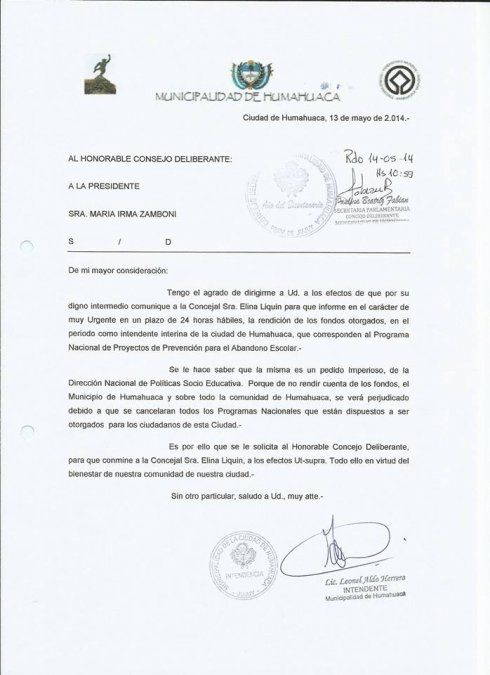 La segunda nota corresponde al 13 de mayo y en ella el intendente Herrera reitera la solicitud de que se comunique a la concejal Elina Liquín, para que en 24 horas informe la rendición de fondos otorgados en el periodo como intendente interina de la ciudad de Humahuaca, que corresponden al Programa Nacional de Proyectos de Prevención para el Abandono Escolar. Se le hizo saber que la misma es un pedido imperioso de la Dirección Nacional de Políticas Socioeducativas.